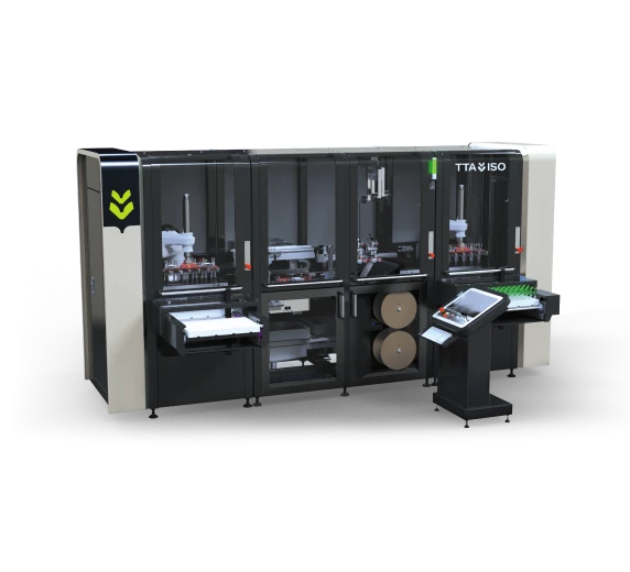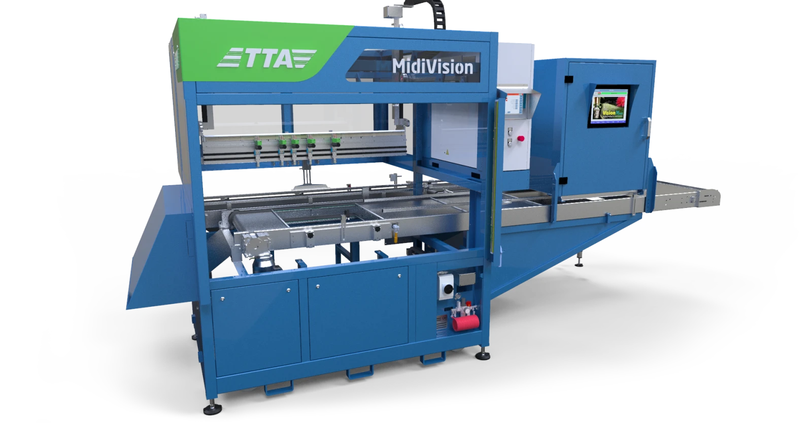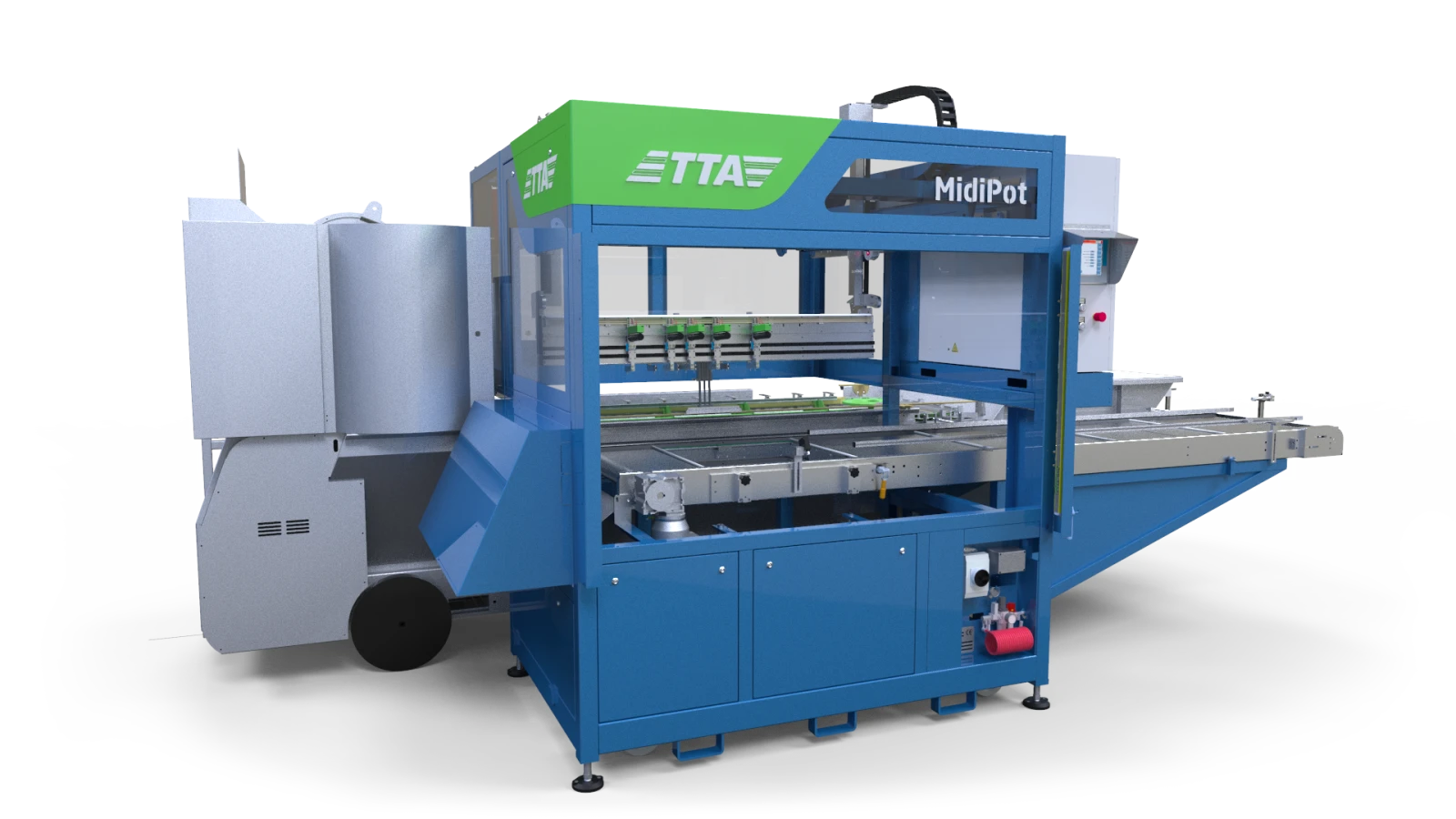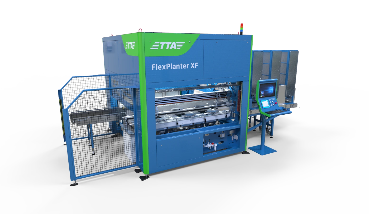 Ultrasnelle transplanteerlijn die jonge planten verplant en direct op kwaliteit sorteert.