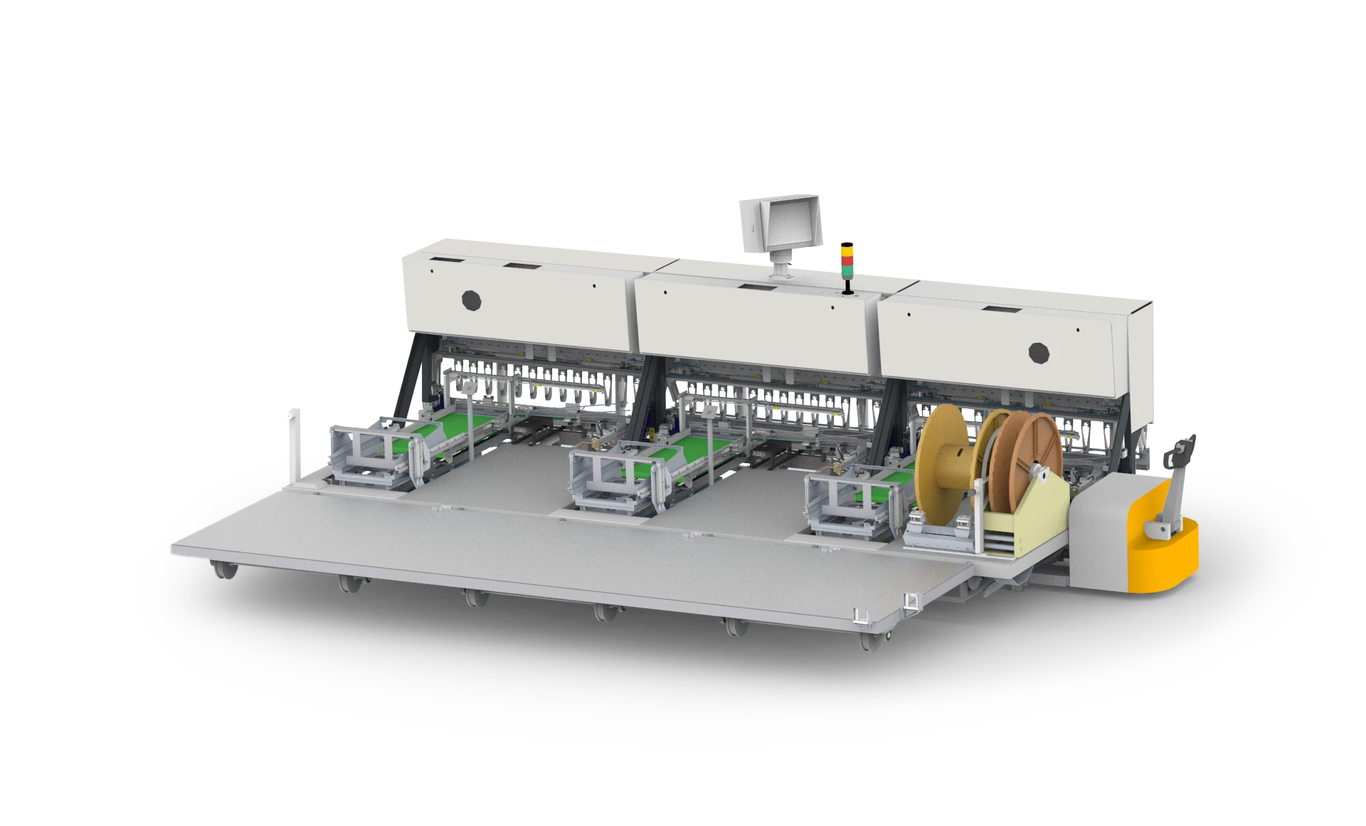 Een dubbel transportsysteem met stopposities voor afzonderlijke trays en bijbehorende werkposities.