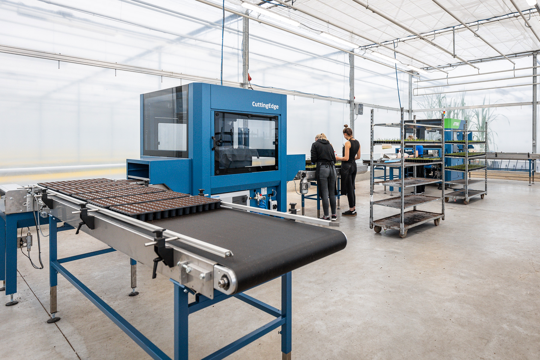 Trays worden handmatig of automatisch op de kettingtransportband geplaatst. De kettingtransportband plaatst de trays vervolgens nauwkeurig op hun bestemming. Stekken kunnen handmatig worden gescheiden op de opnameband of automatisch met VisionAir, dat geavanceerde visiontechnologie en luchtstralen gebruikt om ervoor te zorgen dat alleen perfect gescheiden stekken bij de CuttingEdge wordt afgeleverd.