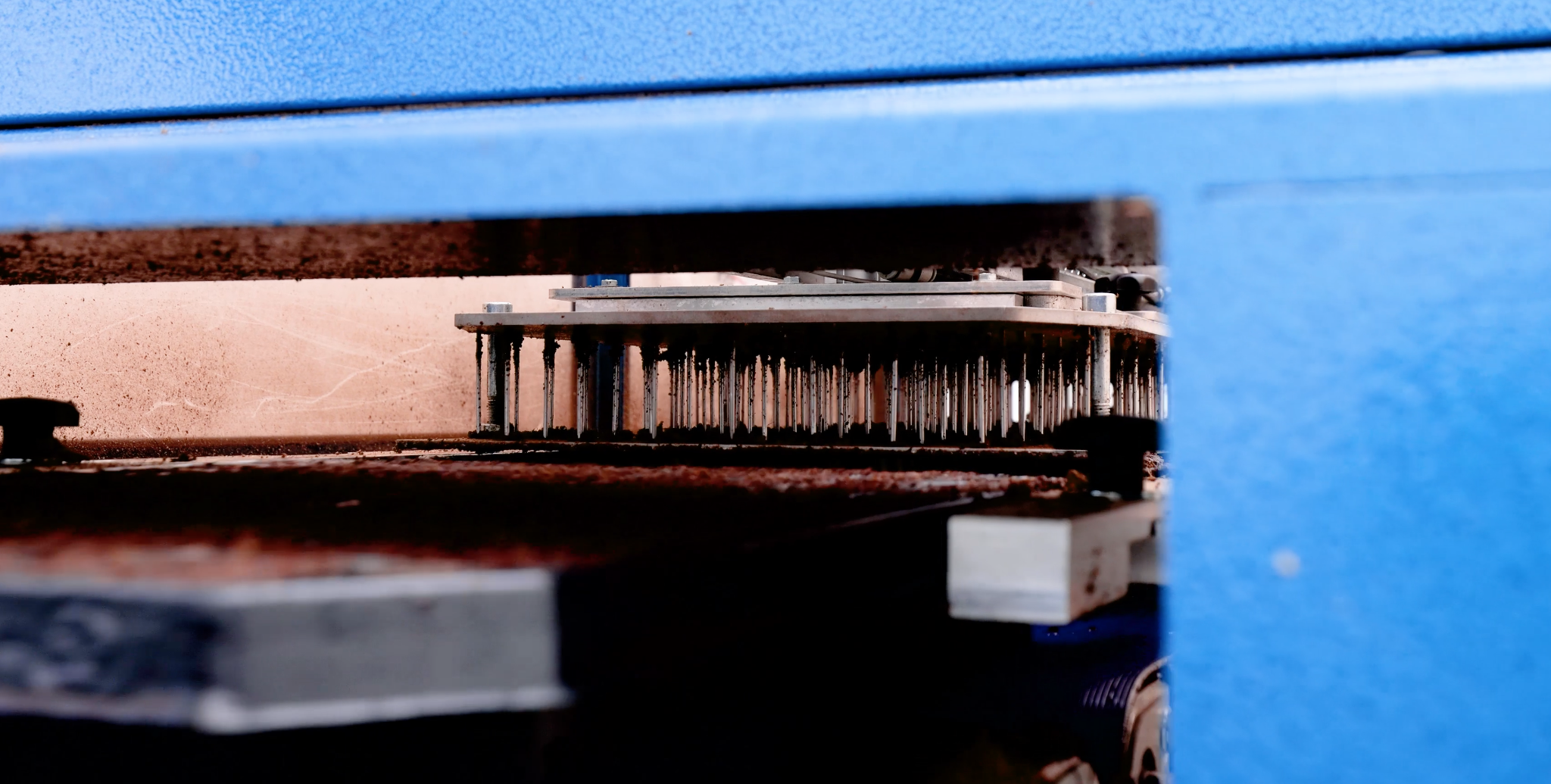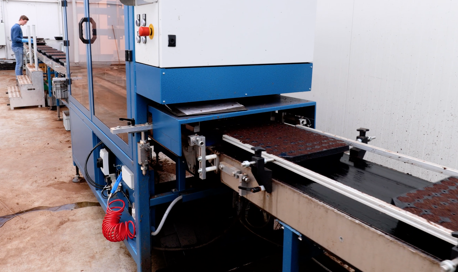 Een plugunit waarbij het veen in de ontvangsttray naar beneden wordt gedrukt.