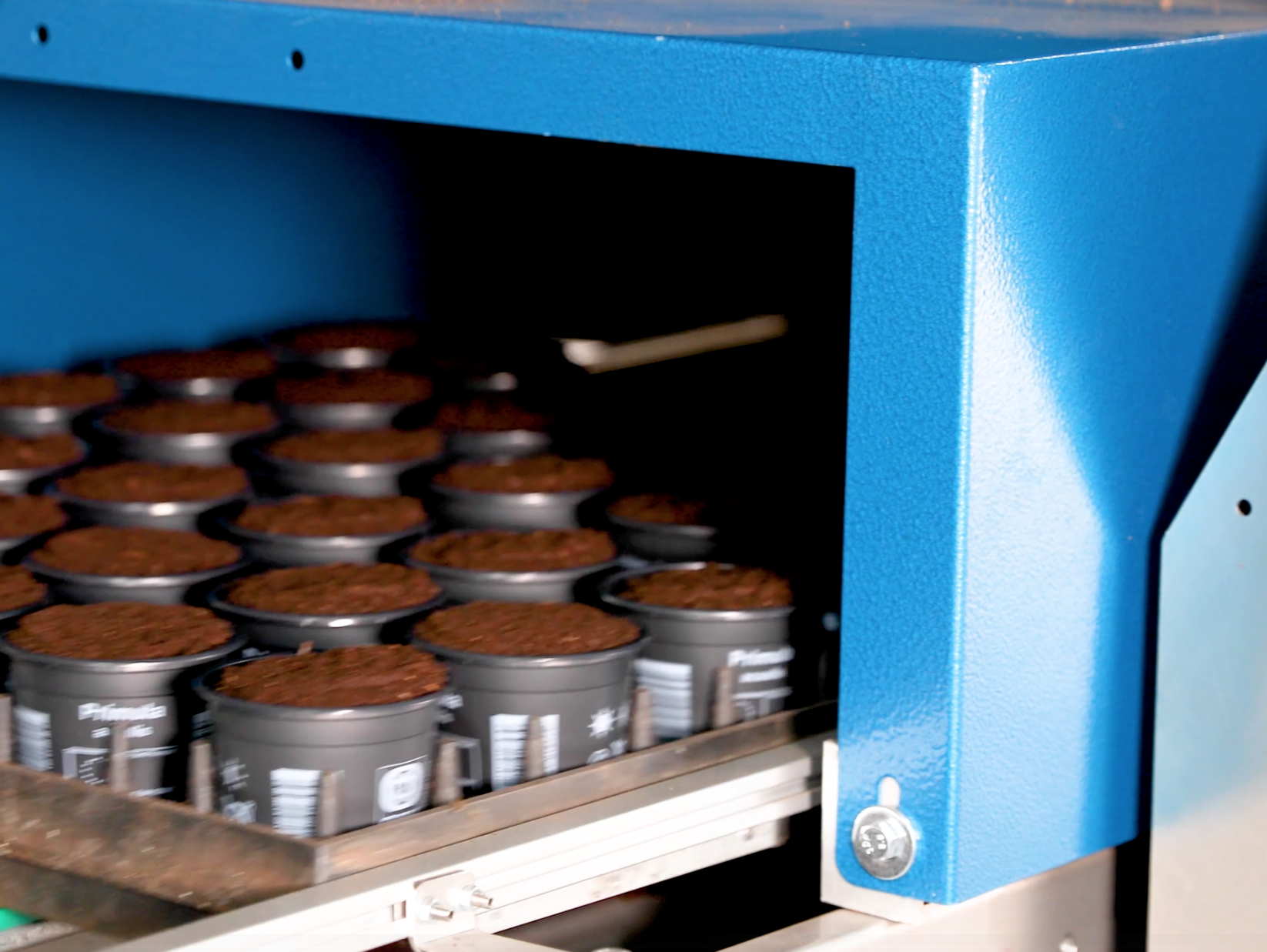 The FlexFiller has adjustable filling density, a smart inbuilt soil return system, and a user-friendly control panel with user interface. The recirculated peat amount depends on setup but is usually < 5%. The maximum filling dimensions are 900 x 600 mm.