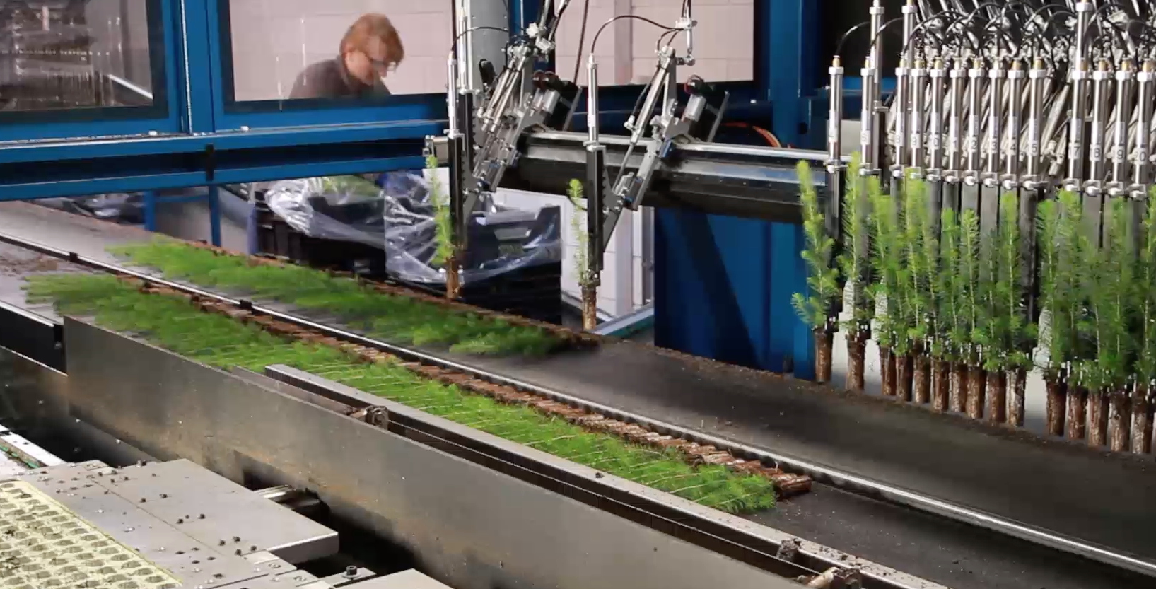 Snelle verpakkingsmachine met een vision selectiesysteem voor jonge boomplanten.