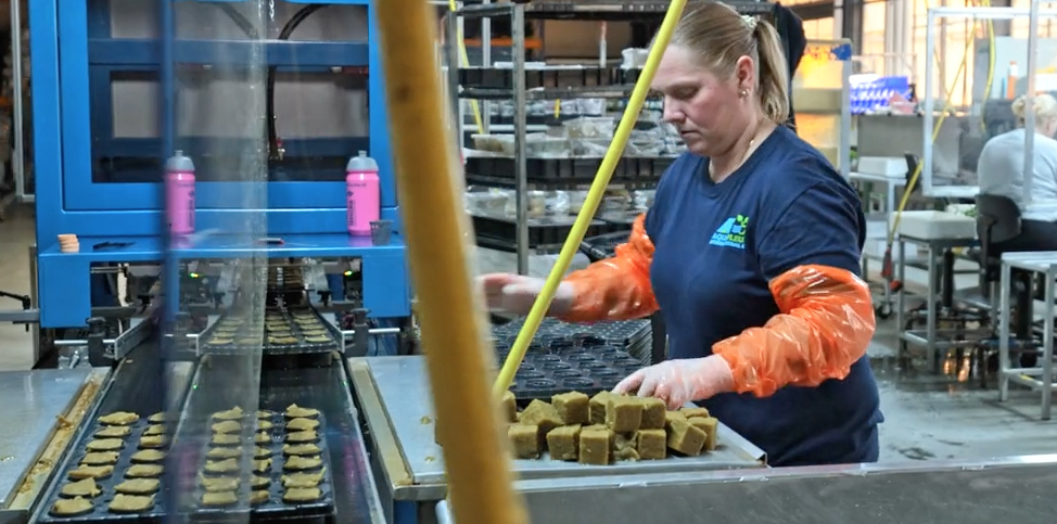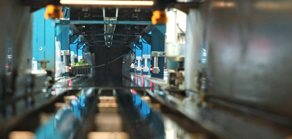 De manual sticking line heeft twee niveaus. Op het bovenste niveau, waar trays de kleeflijn binnenkomen, wordt elke tray afzonderlijk voor de medewerkers geplaatst. Het onderste niveau heeft een transportband met aan beide zijden werktafels. Deze werktafels kunnen kantelen, zodat mensen hun ideale werkpositie kunnen vinden. De werknemers nemen nu de trays van het bovenste niveau. De zwaartekracht helpt hen om het dienblad op hun werktafel te plaatsen.